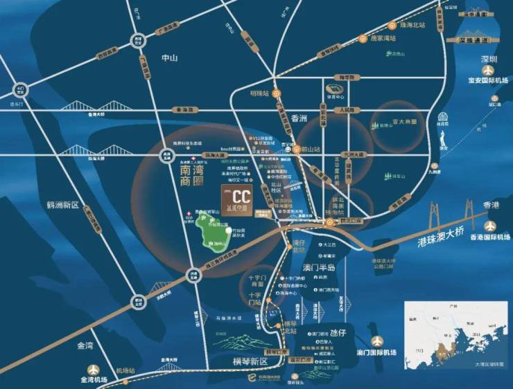 金诚中心,500米即达港珠澳大桥南湾下桥口,直面【港车北上】【澳车北上】人潮、车潮,坐享3口岸5机场3大桥4高速2城轨2大道的【海/路/空/轨/桥】多维立体交通网。