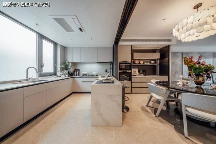 大面宽的厨房内配置了多功能水槽、升降拉篮、超大容量的钻石切角柜、带电磁炉的中央岛台以及国际知名厨电品牌AEG等,甚至连餐边柜都做好了水槽……