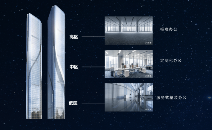 针对楼宇内不同分区,使用分段凭租策略,从企业的初创、成长、成熟三个不同阶段,形成服务式精装办公、定制化精装办公、标准办公等三种产品组合,缔造个性化的办公空间。