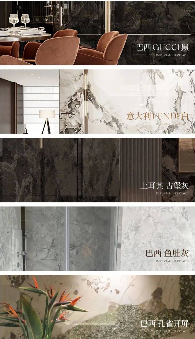 古奇黑、芬迪白、古堡灰、鱼肚灰、孔雀开屏等奢石的运用,每一块都是全球甄选的珍稀石材原料,自带豪奢高级气质,为空间增添无尽的美感与价值。