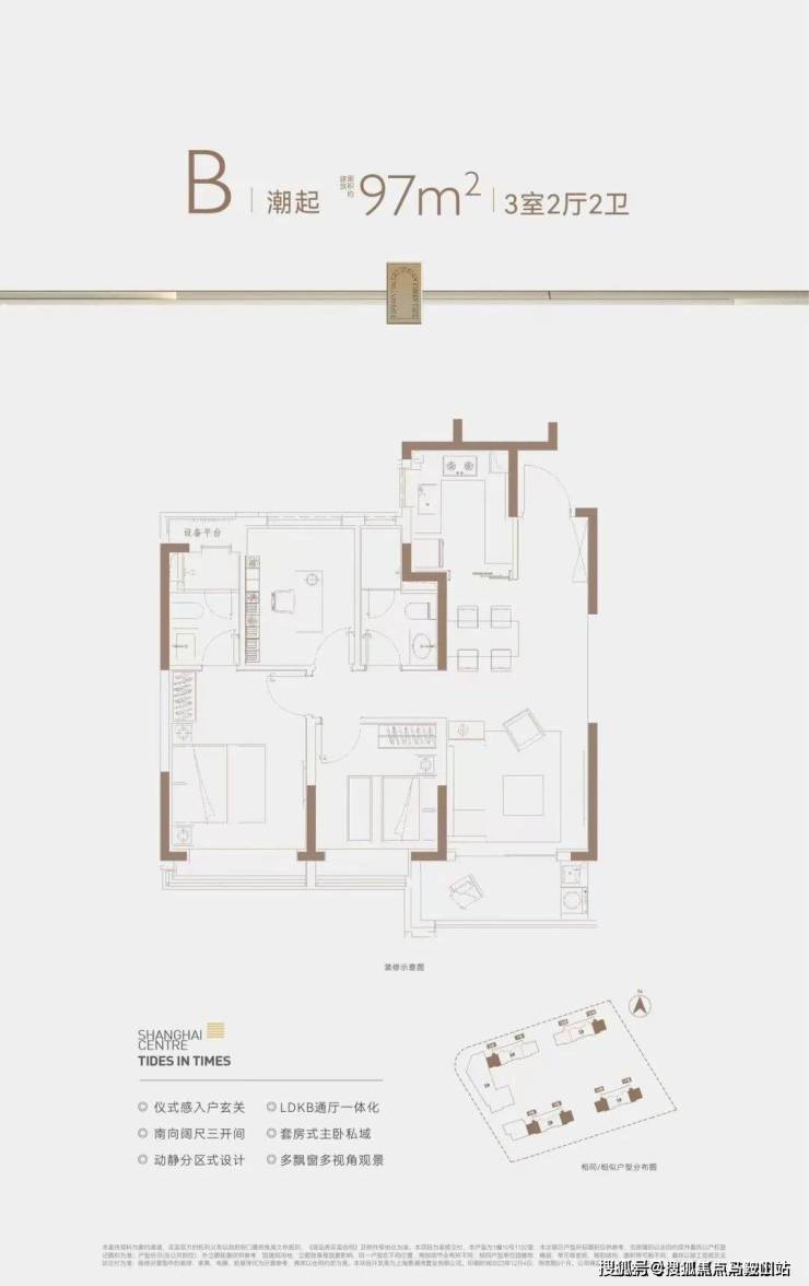 在格局上,户型三开间朝南+动静分离,室内通风、私密性俱佳。