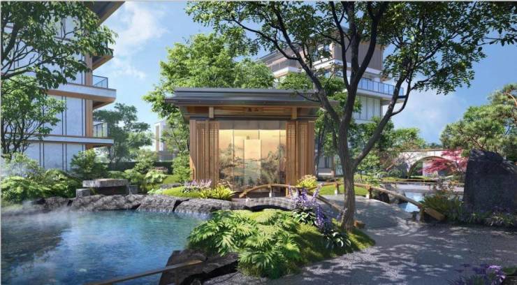 景观方面,大量采用朴拙的原生石材与精致的金属材质相结合,营造古朴与雅致融合为一的意韵。同时,石畔流泉细语,庭院幽深为邻,松隙小径回绕……营造一种隐世又不离烟火气的中式禅境。