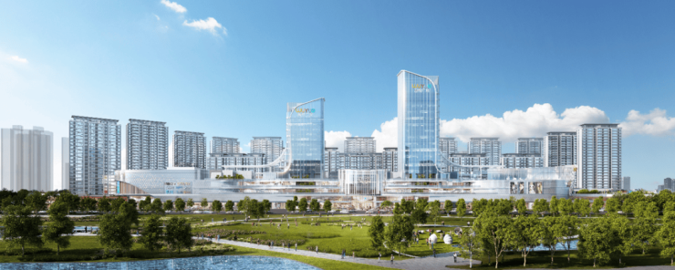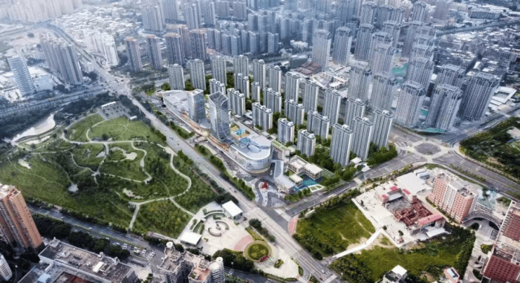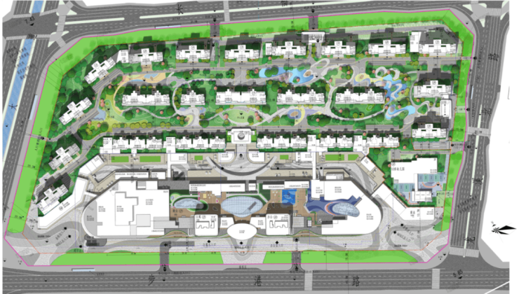 商业与住宅进行合理布局是项目规划的重点。因此,整体上采用沿人民广场城市公园设置商业综合体及高层办公、公寓,商业综合体与住宅之间设置商业内街,是形成区域核心商圈,最大化的营造商业空间,凝聚商业氛围的对策。同时,商业人流动线与居住人流动线分离,保障居住的私密性。