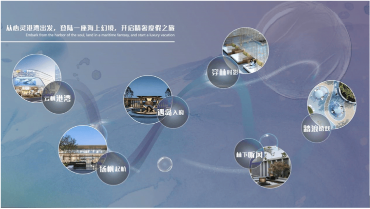景观以现代设计手法,空间氛围、整体风格协调统一,以“海上花园”为主线,从商业云帆港湾出发,登陆一座海上邮轮,开启了扬帆、遇岛、穿林、听风、踏浪的精奢度假之旅,享受与精神契合的隐奢盛宴。