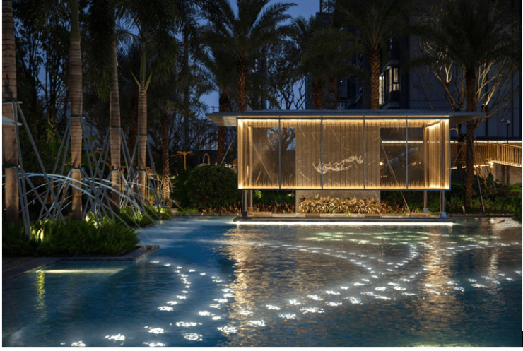 穿过大门踏入,浓郁的度假氛围扑面而来。水面闪烁着柔和的光辉,这是一个全景式度假泳池。巧妙地模仿水仙花的形态,在池底呈现出流畅的线条和丰富的空间层次。泳池的深浅巧妙结合,营造出更丰富的参与感,让孩子们在水的世界里尽情打水仗、玩泡泡,嬉戏欢笑,拥有高频率互动的游玩乐趣,让人感受到置身水中的韵律感,椰林浅滩,给予居住者置身于极具热带风情岛屿的度假体验。