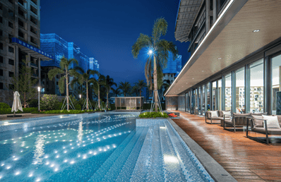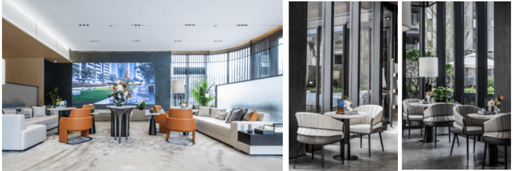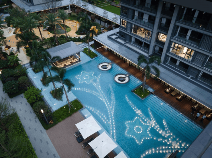 以社区大堂为入口,品悦四季的会所和泳池尽收眼底。在保证功能性的前提下,我们致力于实现多方面的平衡,将艺术美学与城市文化融入其中。