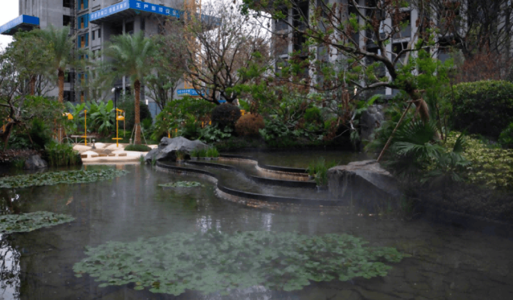 以曲线的手法打造流动的水面,置石堆叠重组,跌水缓缓而下,富有层次的绿植赏心悦目,呈现静谧的场景感,在这通透、开敞的空间,自成一片天地。