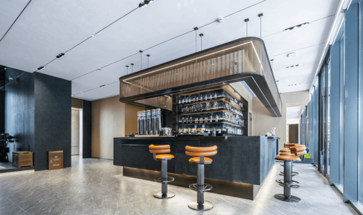 地库车马厅的天花以冲孔铝板和格栅为主材,通过灯光营造波光璀璨,高贵又温馨的氛围,同时将车马厅与车道进行一体化打造,让客户归家时可以体验到如酒店般的奢享品质。