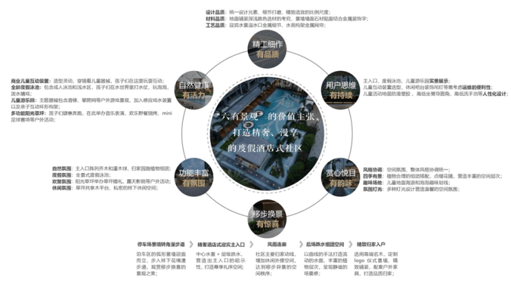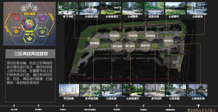 整体社区商业与住区独立分区,住区规划分析上缔造吾心社区+海上花园场景,以三区两线规划,提炼8大功能场景,室外内空间共融,重新定义度假酒店式漫生活。