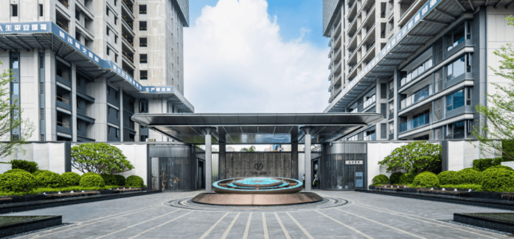 社区入口呈现中轴的内凹式庭园展开,以圆形洄游动线、石材景墙、中心设置动感水幕,营造城市归家的仪式感,创造酒店式的归家体验感。