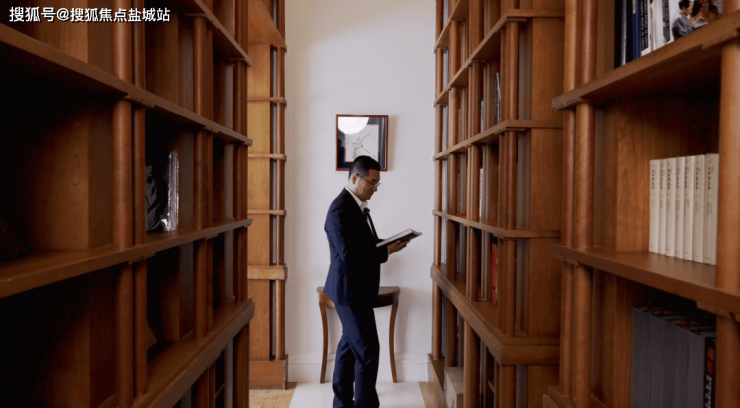 客厅的右边是书房茶室,竟然是全实木打造的书架,常见于博物馆和图书馆,家里极为少见,阵列式庄严肃穆的读书文化氛围就上来了。一楼还有个长辈房,直通花园,窗景就是太湖石和罗汉松,延年益寿。