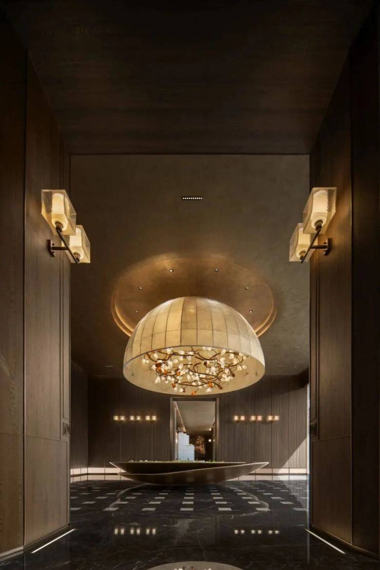 两侧对称的壁灯以温润的玻璃材质透出柔光,与深色木质墙面形成“刚柔相济”的质感对比。空间顶部吊灯以“灯罩”元素为灵感,内部装置构筑充满律动和生命力的曲线造型,柔和的曲线与硬朗的结构形成鲜明的对比,交错的光影营造出层次感,展现出了空间的韵律和自然的和谐美。