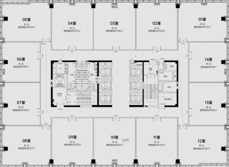 标准甲级写字楼层总高度约120米,单层约1663㎡,由97-127㎡分割,可自由组合