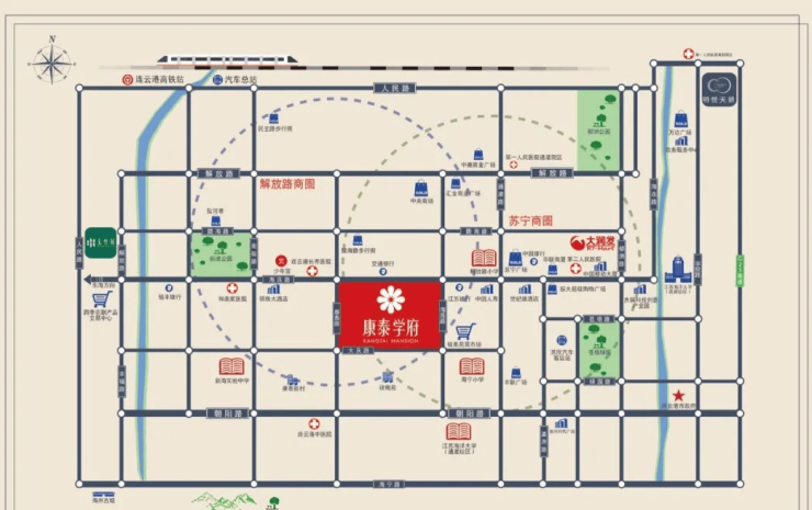 教育医疗:幼小初一站式教育,项目自建公立幼儿园确定为机关实验幼儿园,紧邻解放路小学、海宁小学,新海实验中学(延安本部)是连云港数一数二的中学