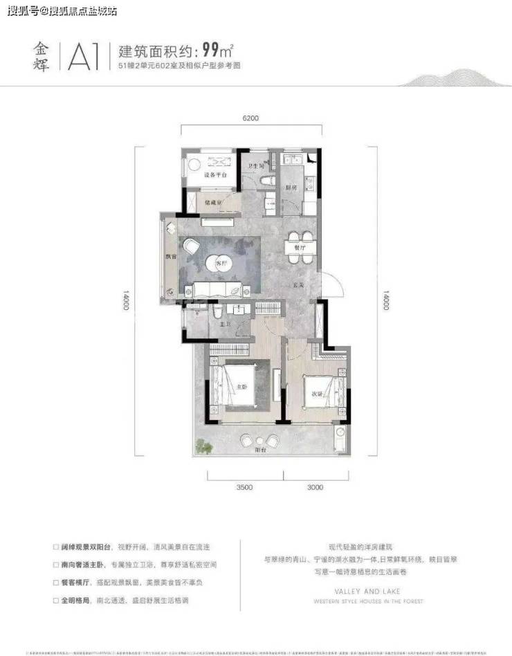 户型点评优势:双阳台设计,完美匹配湖山美景。客餐厨动线合理,观景飘窗连通了室内室外两重空间。南北通透、分区合理,尤其是储藏室的设计,十分贴心。99㎡的大两居,恰到好处地放大了各个功能区,整体看过去十分舒畅。