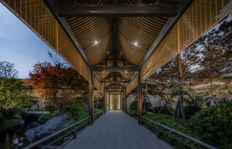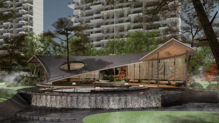 长江中心约43300㎡园林,以“一轴五进十二景”理念,于园中散布十二大主题景观,创造出丰富的情境体验。以《长江万里图卷》为设计灵感,将长江元素与宋氏美学相融合,以画入景。采用五进归家礼序,尊崇宋式礼仪。