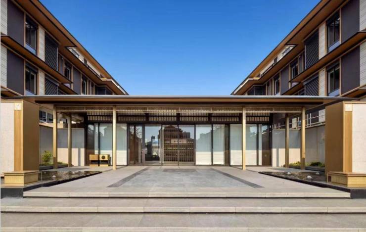🌟春风湖上,借鉴宋式建筑形态(退台、披檐),融合鎏金黄、远山灰等配色;用仿木纹铝板、深灰仿石铝板、钢化夹胶玻璃等上乘材质,兼顾颜值与质感。