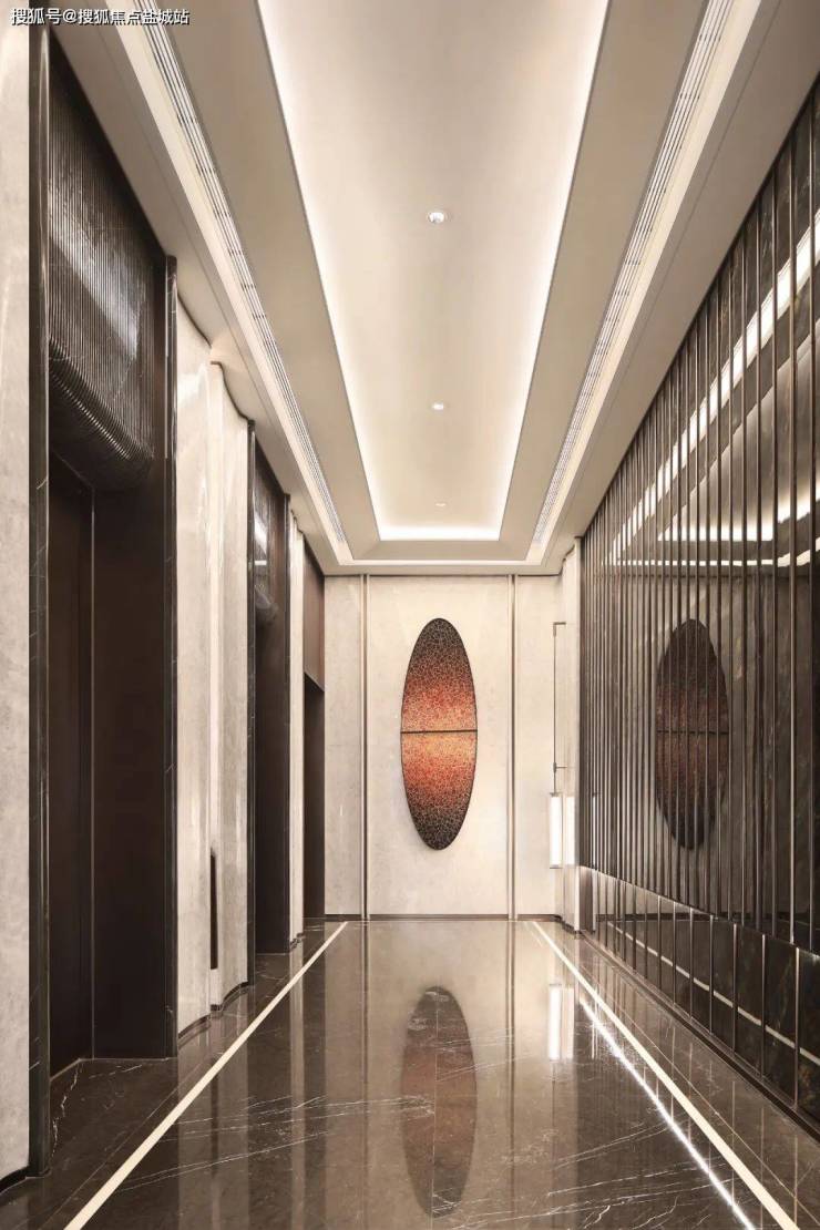 电梯前厅的地面,沿袭保加利亚灰大理石和雅典白玉波打线,墙面覆以清雅玉大理石,就连电梯门套,也被星耀灰大理石包裹,通体丝滑泛光。