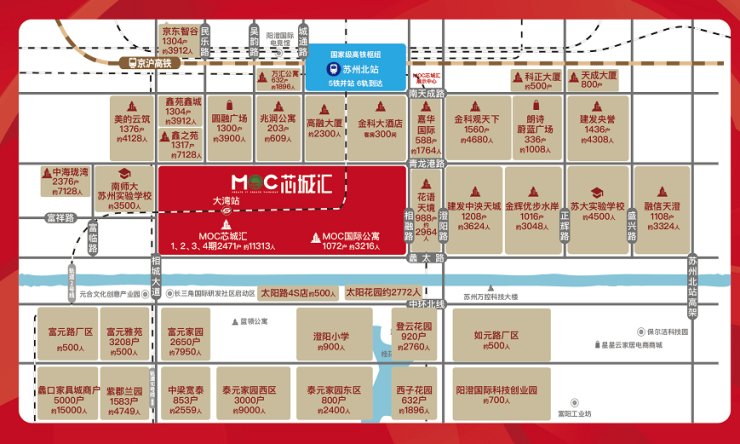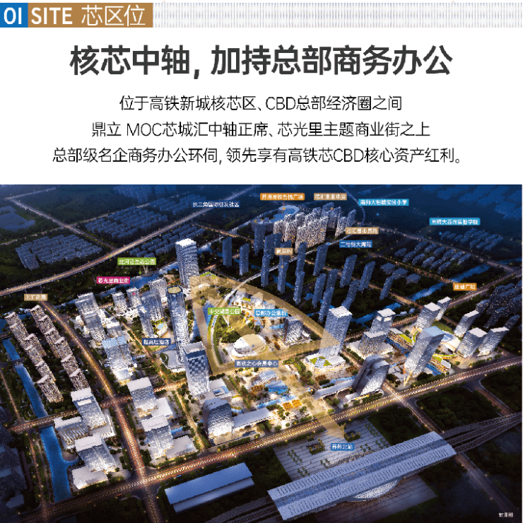 MOC芯城汇是苏州“一城四核”战略下高铁新城规划成型的关键,也是长三角洲建设世界级城市群的中枢高地和活力载体。项目内建设234米超高层地标,23万方吾悦广场旗舰店,3万方会展中心,10万方中央水景公园,500米长的芯光里商业街,5A甲级办公楼集群等。