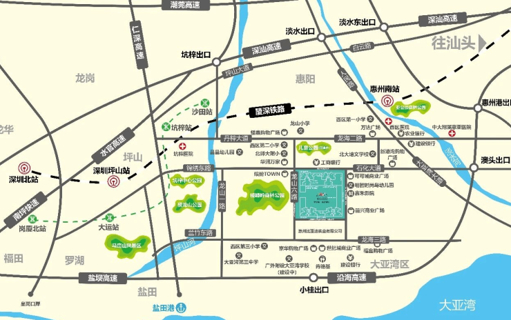 深汕、沿海、惠大三大高速,便捷连接大湾区城市群,实现深惠双城1小时生活圈