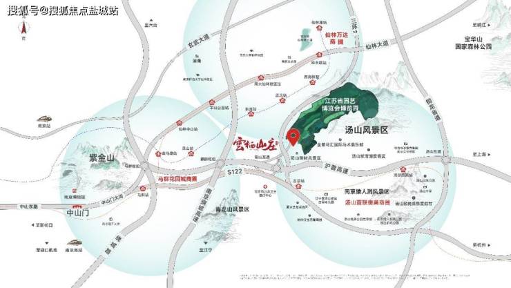 项目位居紫金山东脉,于汤山新城、麒麟新城、青龙地铁小镇核心交汇处 ,坐享紫东新区城市绿肺。