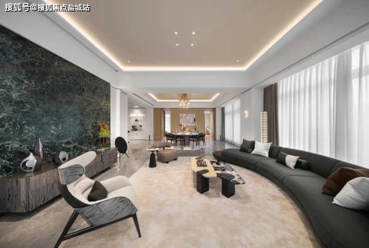 室内空间中,大面积装饰温润质朴的木饰面,挥毫泼墨的写意奢石,意境超凡的玉纹绿大理石,沉稳矜贵的古铜拉丝金属线,共同烘托充满艺术真意的生活场境。