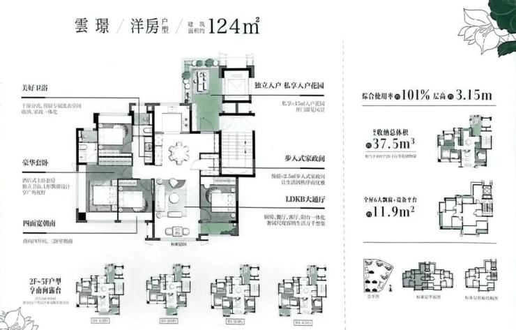 •124㎡洋房独门独户带入户花园,2至5层部分位置有南向晒台,综合使用率达101%-109%