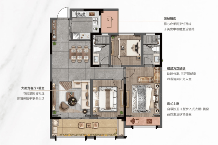 约6米宽厅,盛放三代同堂的欢聚时光;南向双卧套房设计,礼遇全龄家庭成员;餐厨一体布局,让温情与美味自在流动;宽幕阳台引景入室,悦享自然与生活的对话。
