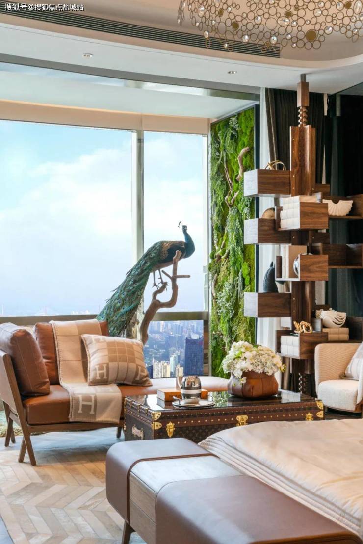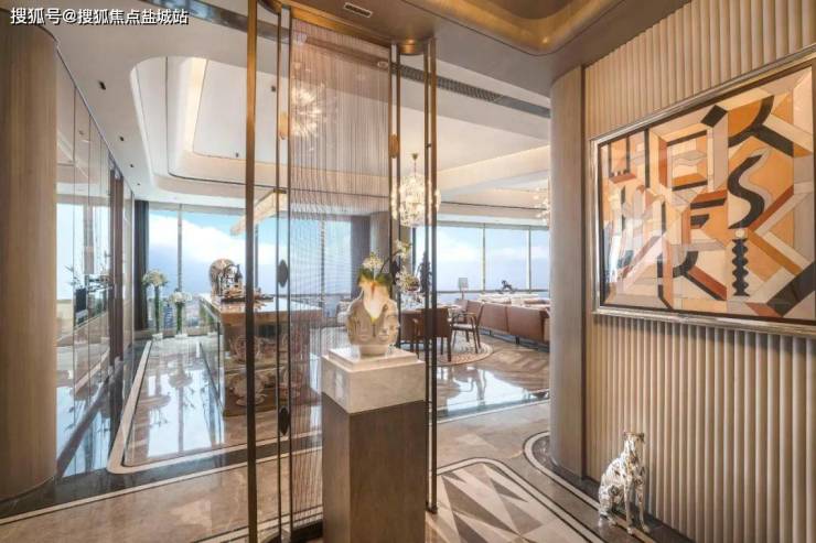 非线性的曲线造型透光玉石墙面,流线型的主卫台盆,奢华波浪,倩影流转,仿佛窗帘轻拂,玉影如流水倾泻,玉润光华,映照岁月轻叹。现今社会安全密室已经成为成功人士居家生活的一部分。主卧室的意大利Agresti安全密室,是用户的私人艺术中心,房子的心脏,更是最安全的堡垒。