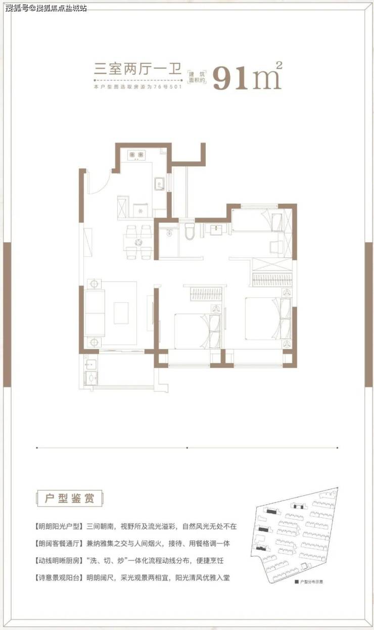 建面约91㎡3房2厅1卫户型,做到了三开间朝南+双朝南卧室带飘窗+动静分离+卫生间干湿分离,采光面拉到极致的小3房户型。