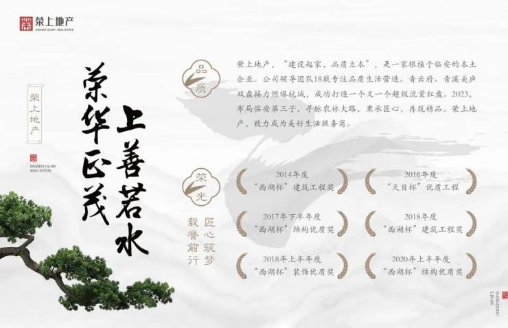荣上地产,“建设起家,品质立本”,18载专注品质生活营造。青云府、青溪美庐双盘接力燃爆杭城。2023,布局临安第三子,寻脉农林大路,隐于青山湖之上,西径山麓神山秀水集贤之地,以纯粹低密大院形制的109席官邸作品,秉承匠心,再筑精品。