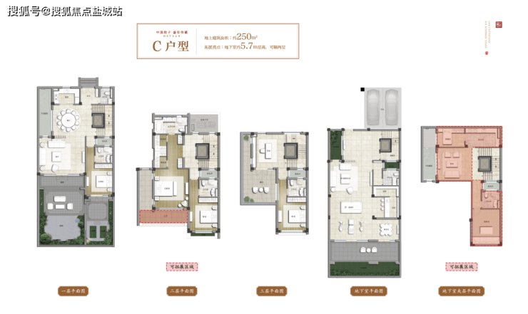 这种大宅的丰赡感,一直从园林延展到了室内。禾原组团的户型,都预留电梯井,大部分卧室都采用套房设计。凡是一楼设计了老人房的,必是带卫生间的套房,对长者特别友好。以约250㎡C户型为例,开间约9.6米,做到了整整4个套房+1个书房。