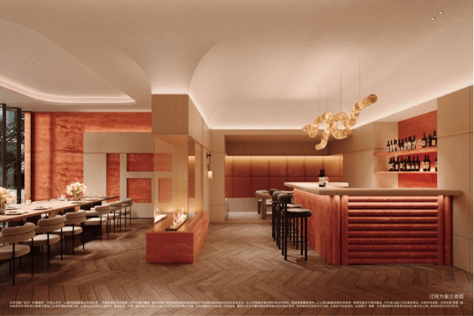 从九龙路哈尔滨路的街区景墙到建筑立面再到泛会所空间应用,伊朗进口红洞石的温润质感贯穿始终。 每一块石板都遵循 30公分的统一标准高度,采用内凹的全双曲面造型——平面带浮线、立面含内凹弧线,这种高难度工艺让石材肌理更显立体高级,犹如奢侈品工匠一针一线打造作品般精雕细琢。