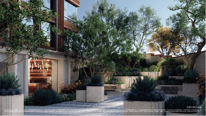 植物搭配上尽显巧思:油橄榄、铁冬青等带着南法风情的植物错落分布,各类花卉四季轮换绽放,春有繁花、夏有浓荫、秋有彩叶、冬有绿意,每一季都有不同的风景。材质选择上更是不吝成本:地面与墙面铺陈世茂金麻、贝金米黄等进口石材,业主可休憩的座位还选用稀缺的奥巴马木奢石,精选整块石材大面积通铺,纹理色泽犹如木材般自然温润;水景采用独特的波浪石材设计,水流淌过时灵动婉转,宛如自然馈赠的景致。更贴心的是社区地面的抬高设计,既有效隔绝了外界噪音与路人视线,保障居住私密性,又让景观更具层次感,置身其中则宛如繁华都市里的隐秘庄园,每一次下楼散步,都是与自然的温柔邂逅。