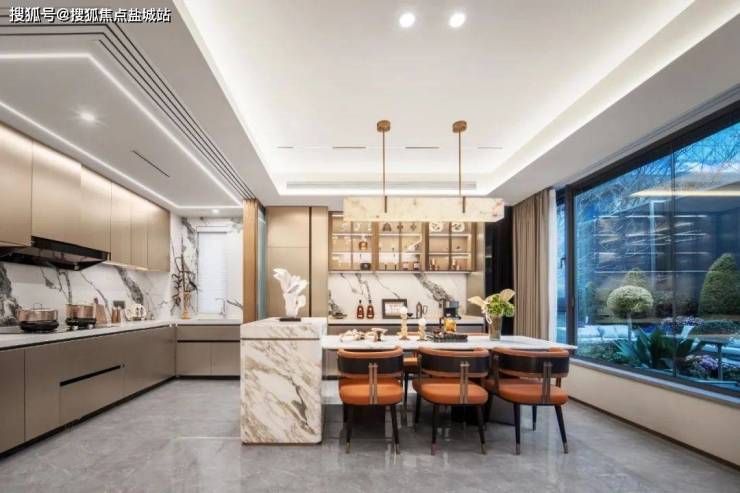 一字叠加别墅144㎡下叠产品,一层客餐厅大横厅设计,厨房利用玻璃推拉门来形成隔而不断的空间效果,业主可根据日常所需自定义空间场景,功能边界不设限,同时可开可合餐厨空间,可轻松容纳会客用餐需求。