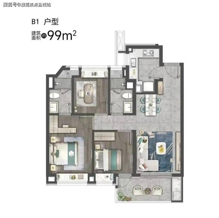 99平的三房两厅两卫,客餐厅连接景观阳台,采光面积更大,为日常生活带来更多的舒适感,并且多了一个卫生间为我们日后带来更为便利的生活。