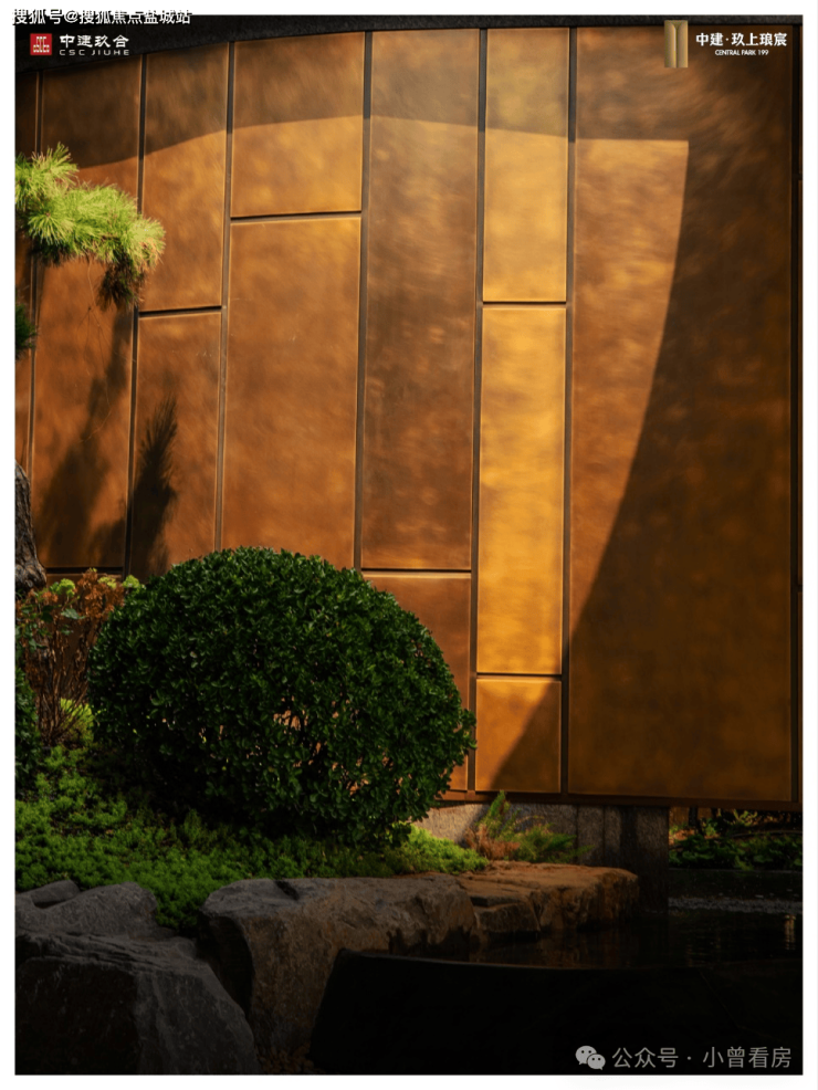 看似普通的铜墙,实际上出自非遗世家、正统传人朱炳仁之手,随时间流转,氧化形成的孔雀绿铜锈在曲面肌理上晕染出层峦叠嶂的写意形态,与前景景石形成虚实相生的当代山水意境。