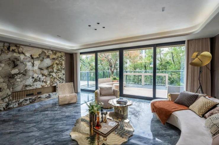 还有全屋奢石,鱼肚白、潘多拉、佛罗伦萨灰、古琦黑等镶嵌其间,每一处皆达到“高定级别”,等级远高于当下市面“量产”的低密产品。