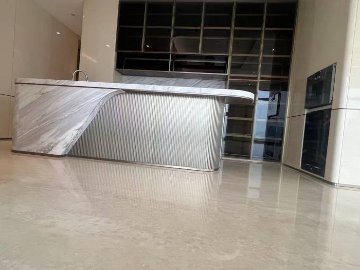 白色的岩板与桃木背景墙让人联想到枫丹白露宫殿的动人秋天。打造生活中的高级感不需要繁琐复杂的浮夸装饰,而是要在空间之内做减法。深色与浅色的交叠呼应之间,让曲线与直线共同构建空间的秩序,匹配房间整体弧形外观,打造内部张弛有度、流畅自如的线条感。