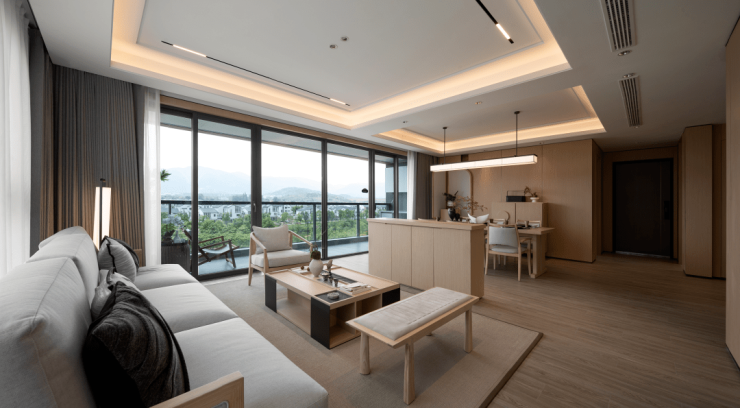 坐酌泠泠水,看煎瑟瑟尘,袅袅山湖间,静谧和诗意缓缓流淌。居住于此,隔绝城市的喧嚣和浮躁,每次呼吸都充满自然的气息,每寸空间都饱含无界自然之美。