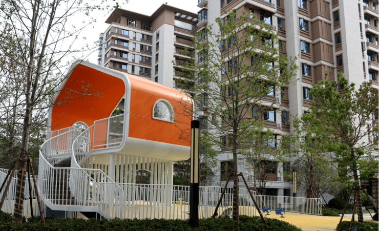 该项目融入海绵城市理念,通过雨水花园、透水路面、调蓄池等设施,确保“小雨不积水,大雨不内涝”,并将蓄存水用于灌溉、洗车等,实现雨水循环利用。超过30%的绿化率营造出立体生态景观:中央绿轴两侧草木葱茏,儿童游乐区传来欢声笑语,创意布局的中央会客厅,营造自然通透的共享空间, "推窗见绿,移步易景"的公园式生活场景处处呈现。