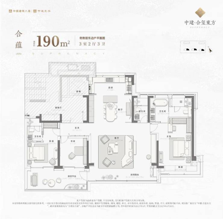 仅18F,仅34席,至为稀缺;女王十字圆厅入户,大宅仪式感;270°环幕端厅,视野最大化;主卧尊享酒店式套房配置,设有独立式衣帽间、双台盆卫生间