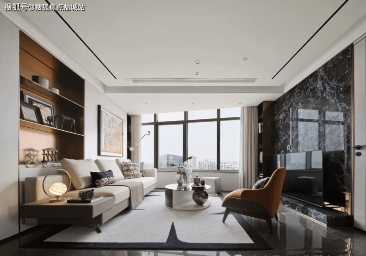 客厅270°采光面,配置弧形沙发,窗前可见上海经典三件套;