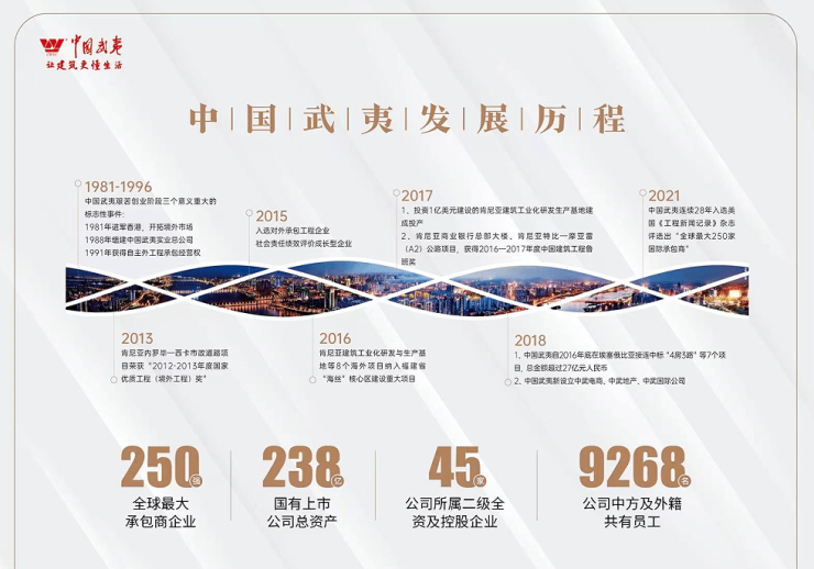 中国武夷成立于1988年,1997年在深圳证券交易所上市,历经30余年砥砺奋斗,中国武夷已成长为房地产投资开发、国际工程总承包、国际贸易、物业服务、精准医学等业务多元化的国有上市公司,公司连续29年入选ENR全球最大250家国际承包商名录,是福建省“走出去”领军型企业。