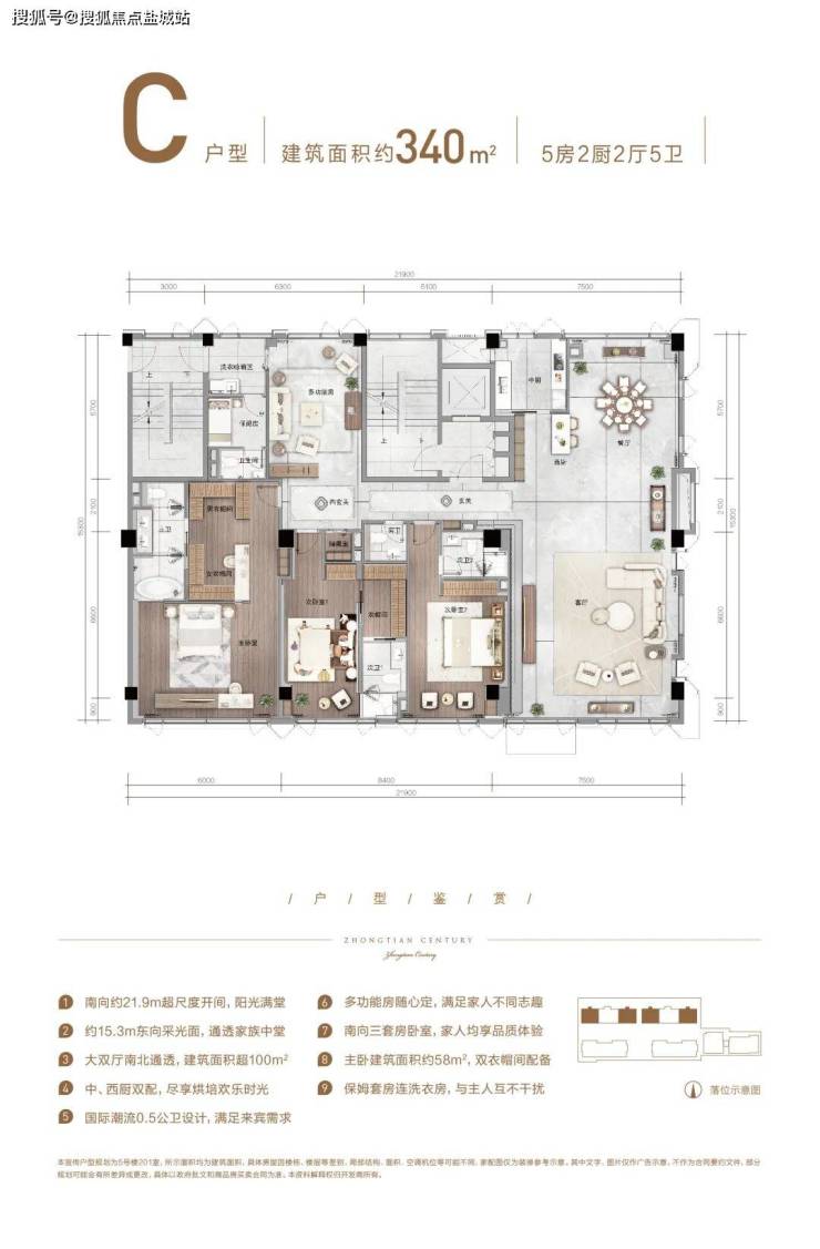 和市面上的其他宽景平层不同,HCC中天纪并没有在300多方的空间里规划出5-6个房间,而是保留了约100方空间作为公共社交空间,完全满足了商务、办公、居住等多重需求。由于公共社交空间被扩大了,因而整个房间的视野和采光面就被大大拓宽了。以C户型为例,四开间朝南,南向的总开间有近22米,西面还有15米的采光面。