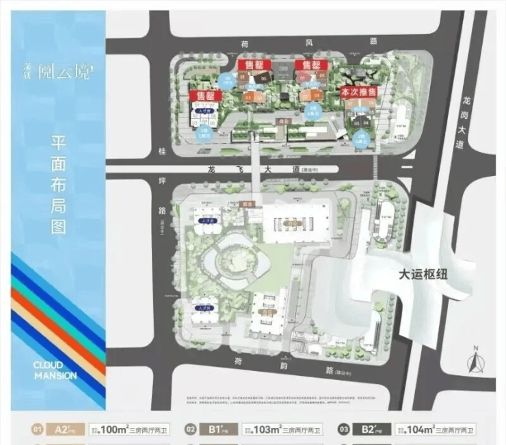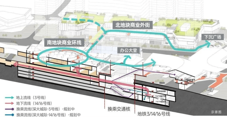 深铁阅云境广场,作为大运交通枢纽上盖物业,总占地面积约5.66万㎡,总建筑面积约51万㎡,以龙飞大道为界共分南北2期开发,有空中连廊相连,北区建设住宅小区,南区兼顾了公共性和便捷性,主要规划超高层办公写字楼和大型商业mall。地处大运枢纽核心地段,也是东部中心首个满足复杂性成熟+商业逻辑的大型TOD综合体项目。