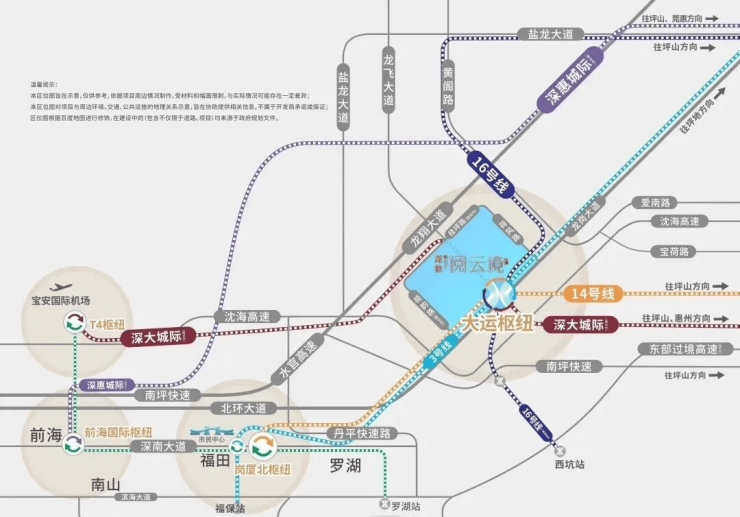 直连大运枢纽,东部唯一集城际、快线、普线于一体的交通枢纽,四轨交汇,3/14/16号线(已开通)和深大城际 (建设中),约28分钟福田岗厦北,半小时宝安机场南山前海。