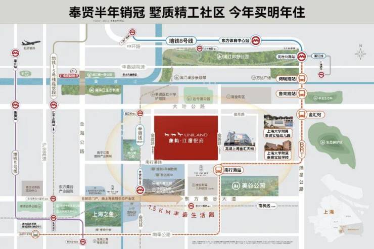 交通上依托浦星公路北接前滩并贯通南北高架,金海公路直连虹梅南路高架快速对接中环,构建起联动浦东浦西的高效路网,是奉贤新城未来承接市区人口外溢的首站。
