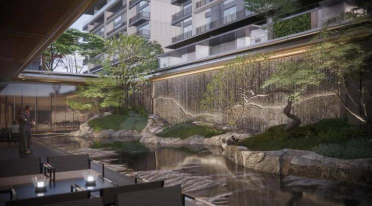 景观设计理念来源于扬州明清名园之画作,提取扬州诗画生活九趣,融入现代生活九境,重新演绎当代城市 “慢生活”场景。形成“一环三轴四园九境”的结构布局,打造一个园中有墅、园中有院、园中有园的现代中式雅奢住区。