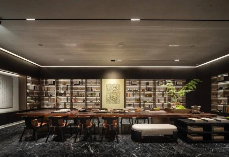 环绕式的书架文雅十足,书柜里除了书籍,同时设置宋氏书画和器物,展现宋代文人的生活情趣,遵循内心的宁静,营造沉浸式阅读体验。
